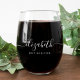 Give the best mum ever a unique gift with this chic personalized stemless wine glass, showcasing her name monogrammed in a stylish white calligraphy script with swashes and "Best Mum Ever" in elegant white typography.