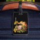 This rectangular black luggage tag features a vibrant illustration of a small green-headed bird perched in a nest of golden leaves. it can be personalized with any name you would like it is printed on the right side.
