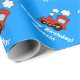 Personalized Birthday wrapping paper | red toy choo choo train. Toy locomotive cartoon design with customizable name of child. Railroad theme gift wrap for young boy or little baby. Blue background color customizable. Cute idea for 1st Birthday or baby shower party. Children's toy graphics. Also nice for Christmas holidays.