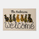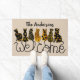 This adorable cat-lover welcome mat features 7 stylized kitties, with different gold and black hand drawn patterns. Their cute cat tails write the word "Welcome"