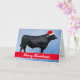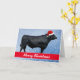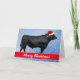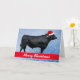 A photo of a black Angus bull wearing a Santa hat on a background of snow is perfect for the Angus breeder.