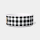 This unique custom pet dog bowl features their name personalized in classic all-caps serif text with beige / tan dog bone nameplate and a rustic farmhouse buffalo plaid check patterned background in black and white colors. A stylish water and food bowl for your furry family member, available in medium and large sizes.