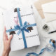 Personalizable giftwrap idea with custom name and Happy Holidays message.