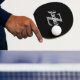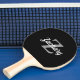 This personalized ping pong paddle features a light gray monogram and white retro script name on a black background.
