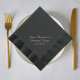 Elevate your elegant dinner or special event with these personalized black paper napkins. Perfect for weddings, corporate events, or formal parties, each napkin features a sophisticated script in real foil printing. Choose from silver, rose gold, or gold foil to match your theme. Sold in sets of 50, these napkins add a touch of luxury and refinement to any table setting.