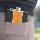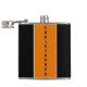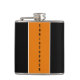 Classic masculine flask with two thin white stripes and a wide vertical orange stripe on the center with custom name on it.