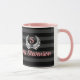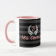 Unique gift mug for teacher or any lady with sassy style. Elegant personalized trendy style. Wide horizontal black on black Stripe background with pink lettering and white laurel wreath. Add name, monogrammed single letter initial and name to this personalized trendy mug.