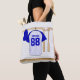 Personalized blue and white baseball jersey hanging in a sports locker room with a baseball cap, baseball bats and ball which is fully customizable with your own name and number. Great gift for any baseball, t-ball or softball player or fan.