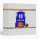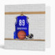 Personalized blue and white basketball jersey hanging in a sports locker room with a basketball, basketball shoes and a water bottle. The sports jersey is customizable with your own number and name to create a truly unique gift for the basketball player or basketball fan.