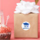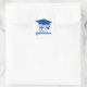 Masculine blue and white graduation sticker begins with a graduation cap or mortar board in two shades of deep blue. Class of and the graduation year is written below in a bold, blue athletic inspired font. The same font is used in the graduate's last name, but a large script font is used for his first name to give the graduation sticker personality. Use this blue and white graduation sticker to seal graduation announcements and graduation party invitations.