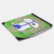 Cute baseball themed design. Featuring on the front a blue and white striped baseball jersey which can be customized with a name and number, a blue baseball cap, baseball and baseball bat. The background features a baseball field.