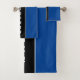Stylish Royal Blue Bath Towel Set with two thin white stripes and a wide vertical black stripe on the center and custom name on it.