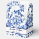 A wedding favor box with a blue floral toile design and space for the bride and groom's name and wedding date.