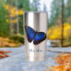 Beautiful blue morpho butterflies highlight this stainless steel insulated tumbler.