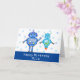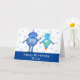 A fun and colorful happy birthday card. The design features two cute and friendly robots in coordinating shades of blue. A waving robot and its flying buddy are surrounded by gear-shaped confetti. The front of the card is personalized with the recipient's name. The inside of the card features a bold gear pattern and there is also a blank space for your own message.