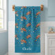 This sea turtle bath towel design is complete with a seamless pattern of brown sea turtles set against a pretty blue background as well as a place to add your name. The background includes rocks and sea floor plants.