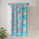This summer-themed bath towel design is complete with a seamless pattern of flamingo pool floaties, pitchers of lemonade, sunglasses, and palm trees set against a blue background. There is a place to add your name at the bottom of the towel.
