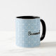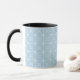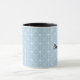 This elegantly patterned mug is light blue with a geometric tiled pattern of lines and curves, giving an impression of flowers on a trellis. Personalize with the recipient's name for a stylish individual gift.