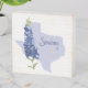 Texas, bluebonnets and a little southern charm. State of Texas in soft purple with a single bluebonnet stalk and your name in dark blue text. Pale hand drawn chevron pattern in the background. Matching products available.