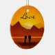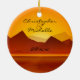 Personalized Cute Cartoon Silhouette Couple Boating LOVE Christmas Ornament. Features a Mountain and Sunset Background.