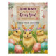 Celebrate Easter with this adorable, boho-inspired postcard, perfect for little girls! Featuring three fluffy yellow bunnies with flower crowns, hopping through a colorful meadow filled with wildflowers and pastel vibes. A rustic wooden sign reads, ‘Some Bunny Loves You!’ while the customizable text says, ‘Happy Easter, [Name]’—defaulted to ‘Happy Easter, Courtney’ but easily altered by the buyer. This charming, whimsical design blends boho flair with Easter sweetness, making it a delightful keepsake or home decor gift for your special bunny!