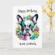 Ai art depicting a cute Boston Terrier surrounded by pink and yellow flowers personalized birthday card. Funny Boston Terrier dog birthday pun.