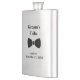 A fun groomsmen gift. A flask with a bow tie. Personalize the top and the bottom text sections.