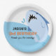Kid's birthday party paper plates featuring a shark and a blue ocean background. Personalize this product by adding your child's name, age, the event date, a thank you message, or any custom text. Great for a big sea animal theme birthday party for a boy.