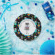 Robot themed personalized birthday party paper plates. Colors: blue, yellow, lime green and red.