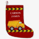 Cool custom dump truck Christmas stocking for a child who loves yellow construction vehicles on red. Fun vehicle design for a little boy who loves cars and trucks. Customize with your kid's name under the black and yellow caution tape.