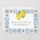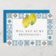 Pop the question in style with these unique bridesmaid proposal cards, featuring vibrant watercolor lemons and a classic blue and yellow tile motif inspired by the charm of the Mediterranean. Whether you're planning a lemon-themed bridal event or just love a fresh citrus vibe, these cards offer a memorable and meaningful way to ask your favorite people to stand by your side.