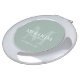 This design features personalized bridesmaid's name with title and wedding date in white and monogram in sage green as background, in classic serif font style, on sage green background.