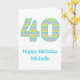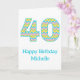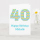 A bright and cheerful birthday card for a landmark birthday. The front of the card features the number 40 in a bold and modern chevron pattern. The design has an upbeat and playful color palette of turquoise blue, pink, green and yellow. There is a happy birthday message together with the recipient’s name which makes the card special and unique. The inside message reads “It’s time to celebrate! Happy 40th birthday!”. This card is a perfect way to mark a milestone birthday.
