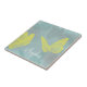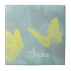 A pretty yellow butterfly pattern over a blue-gray grunge watercolor foliage background. Personalized with your name in trendy white script.