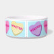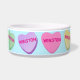 This Valentine's Day show your dog or cat how much you love them all month long or all year long. Nostalgic candy hearts in pastel pink, green, purple, yellow, and blue circle this pet bowl and each heart is customized with your dog's name. A very cute personalized design for your pet. Light blue background.