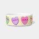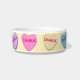 This Valentine's Day show your dog or cat how much you love them all month long or all year long. Nostalgic candy hearts in pastel pink, green, purple, yellow, and blue circle this pet bowl and each heart is customized with your pet's name. A very cute personalized design for your pet. Light yellow background.