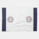Personalized captain anchor logo kitchen towel with your name and boat name. Navy blue and red circle emblem on a white background with navy blue border.