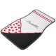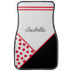 Personalized car floor mat with red and black design.