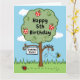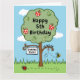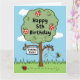 A sweet greetings card to celebrate a birthday, which can be personalized with the name, date and numbered birthday. The card features a colorful garden scene with an apple tree, a bumblebee buzzing around and a ladybird scuttling on the ground.