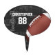 A modern American football grid iron design featuring a football on a chalkboard typography background with football terminology in the background. The design features customizable text for the name and number of the football player or grid iron fan. This design has been made in part with graphics licensed by Graphics Factory.
