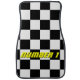 Personalized checkered flag auto racing car mats. Number 1 one or custom text like a team name. Automotive speed race theme design. Black and white with yellow text. Cool sports gift idea for men, dad, husband, brother, mechanic, taxi driver, racer etc Sporty dynamic typography.