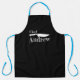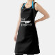 Cool Customizable Personalized Black Chef Mens Womens Apron. Displayed is black chef apron with cool knife design and customizable chef name in white letter print. Apron color, strap colors are customizable to suite your needs to your personal taste and needs. The graphic of chef knife is provided in two black and white colors to accommodate light or dark aprons.