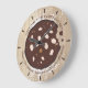 Big chocolate chip cookie with flour splat and faux wood background on this kitchen clock perfect for a bakery or your favorite cookie baker, personalized with text top and bottom.