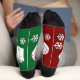 Christmas socks featuring a whimsical one red, one green design. The socks are adorned with artwork of Christmas trees, stockings, ornaments and gifts. The art is surrounded by snowflakes, with room for names or a custom message on each sock! Message MineByDesign for help with this design or any other design you envision!
