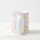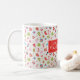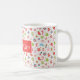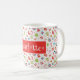 A cute Christmas mug that can be personalized with a person's name or monogram initials. This design featuring gifts, stockings, candy-canes, snowflakes, ornaments and bells in traditional Christmas colors.