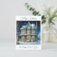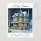Seasonal winter house illuminated on a snowy night personalized Christmas postcard.