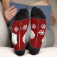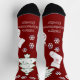 Christmas socks featuring a whimsical design. The socks are adorned with artwork of Christmas trees, stockings, ornaments and gifts. The art is surrounded by snowflakes, with room for names or a custom message on each sock! Message MineByDesign for help with this design or any other design you envision!