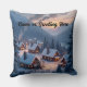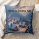 A cozy mountain village blanketed in snow, glowing windows, smoke rising from chimneys, and twinkling string lights along rooftops as the sun sets behind pine-covered hills.