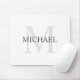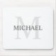 features personalized name in grey and monogram in light grey as background, in classic serif font style,