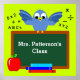 Customize this personalized classroom poster of a happy bluebird cartoon perched chalkboard with teacher's name and apple and books in foreground. Will brighten up any elementary school class. Background color can be changed too.
